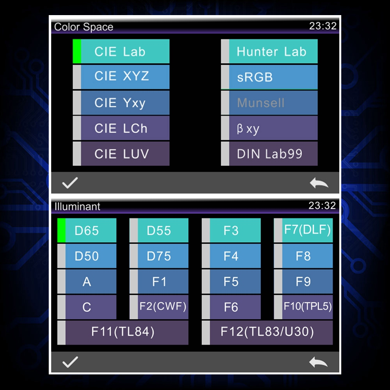 Cung cấp không gian màu CIE LAB, XYZ, Yxy, LCh, CIE LUV, Musell, s-RGB, HunterLab, βxy, DIN Lab99 và D65, A, C, D50, D55, D75, F1, F2 (CWF), F3, Nhiều nguồn sáng quan sát F4, F5, F6, F7 (DLF), F8, F9, F10 (TPL5), F11 (TL84), F12 (TL83 / U30) có thể đáp ứng các yêu cầu đo đặc biệt trong các điều kiện đo khác nhau.