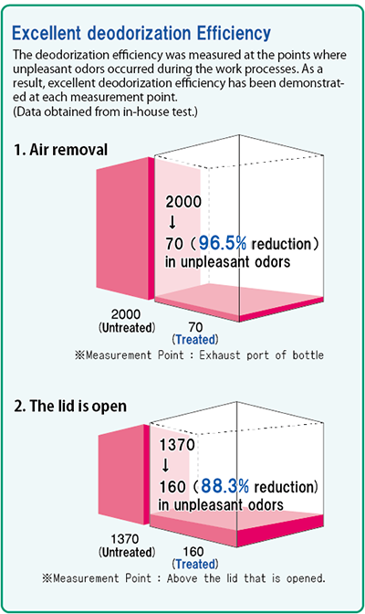 Các hơi gây mùi khó chịu và bay lơ lửng trong không khí trong quá trình gia nhiệt và không tải được giảm bớt, và hơn nữa, mùi hôi được khử bằng bộ lọc khử mùi.