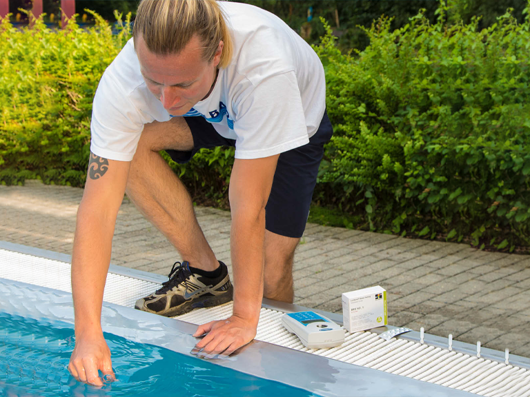 Từ A (lkalinity-m) đến H (hydrogen peroxide), các thông số quan trọng nhất của hồ bơi đều được đo.