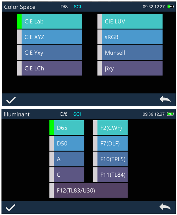 CIE LAB, XYZ, Yxy, LCh, CIE LUV, s-RGB, HunterLab, βxy, DIN Lab99 Munsell (C / 2) |