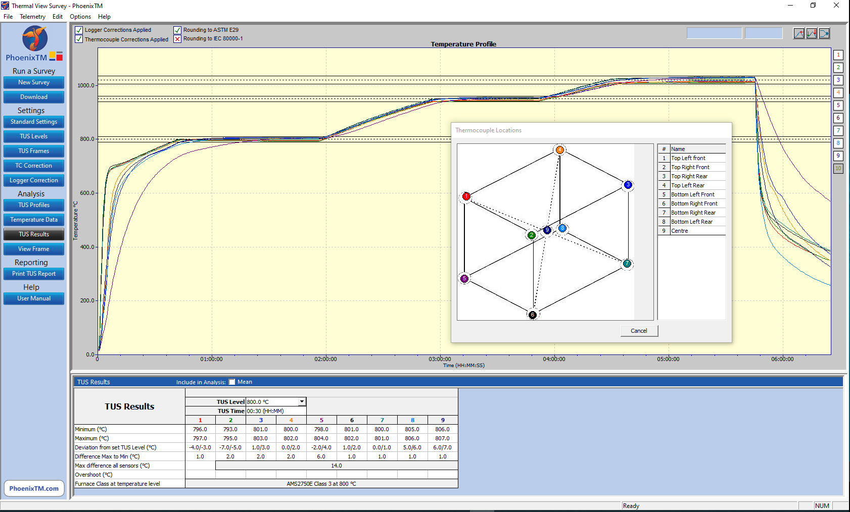 Khi sử dụng Hệ thống PhoenixTM với Đo từ xa RF tùy chọn, dữ liệu TUS được truyền trực tiếp từ lò trở lại PC giám sát, ở mỗi cấp độ khảo sát, dữ liệu nhiệt độ có thể được theo dõi trực tiếp, với các hệ số hiệu chỉnh Cặp nhiệt điện và Máy ghi nhật ký được áp dụng. Phần mềm Khảo sát Chế độ xem Nhiệt tạo ra các báo cáo TUS tuân thủ đầy đủ các yêu cầu của tiêu chuẩn AMS2750 / CQI-9. hiệu quả.