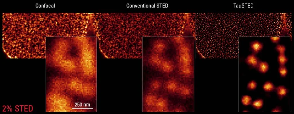 TauSTED phân biệt các photon đến từ quy trình STED với các photon của nền, sử dụng gradient thời gian sống huỳnh quang do sự hiện diện của STED gây ra. Kết quả là bạn có thể thực hiện tạo ảnh với độ phân giải vượt xa STED* thông thường với liều lượng ánh sáng thấp hơn đáng kể, cho phép thực hiện nội soi nano tế bào sống trong thời gian dài.