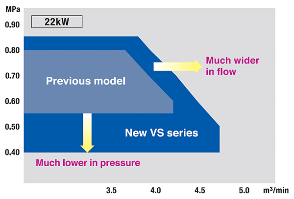 Tính năng Kiểm soát Dải Áp suất Rộng của Dòng KOBELION VS có thể cung cấp lưu lượng không khí cao hơn nhiều khi máy hoạt động ở mức áp suất thấp hơn. Dòng KOBELION VS cảm biến áp suất đường ống và tự động thay đổi giới hạn vòng tua (rpm) tối đa. Dòng KOBELION VS mới đạt mức lưu lượng không khí cao và dải áp suất rộng hơn nhiều. Là công ty hàng đầu về máy nén khí kiểu Biến tần, chúng tôi có thể cung cấp cho khách hàng những giá trị công nghệ tiên tiến.